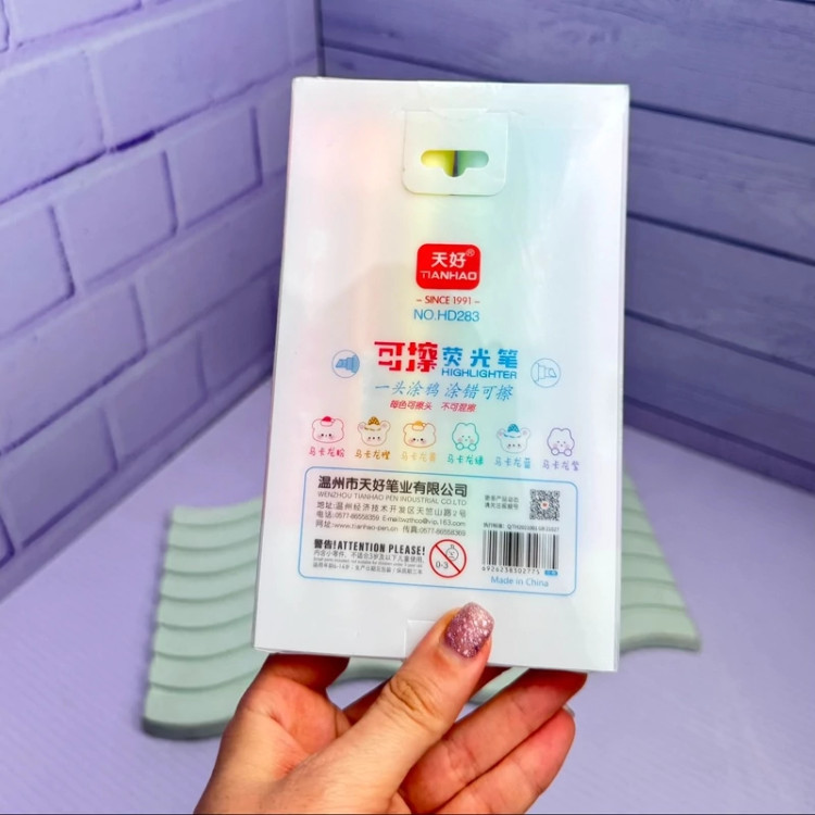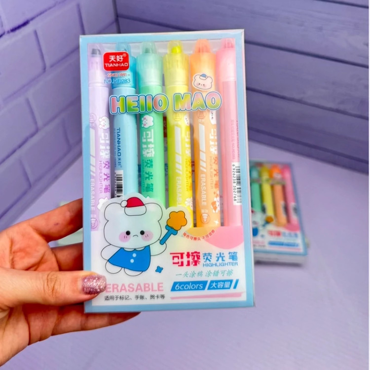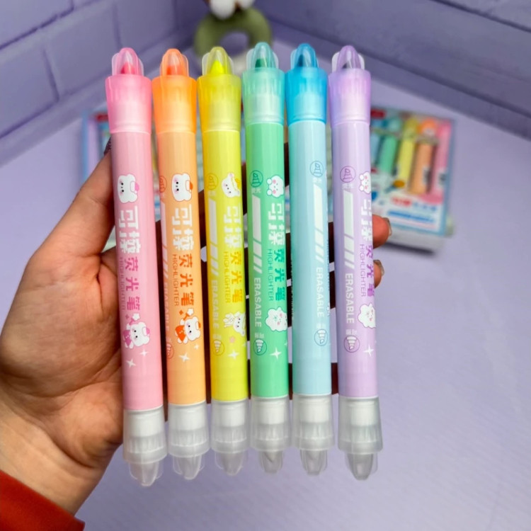هایلایتر پاکن دار دوسر فانتزی 6 رنگ یه سر رنگی و سر دیگه سفید هست که پاک میکنه سایز بزرگ تقریبا دوبرابر هایلایتر های دیگه ست دیگه هرجا رواشتباه هایلایت کردید اصلا نگران نباشیدچون با سر دیگه ش خیلی راحت مثل اولش پاکمیشه بسیارباکیفیت وارداتی