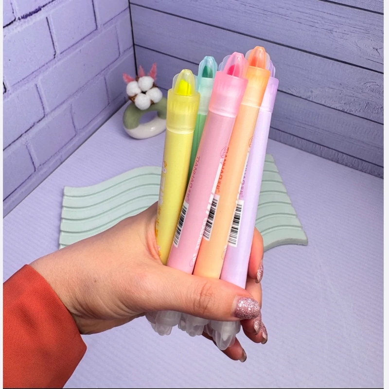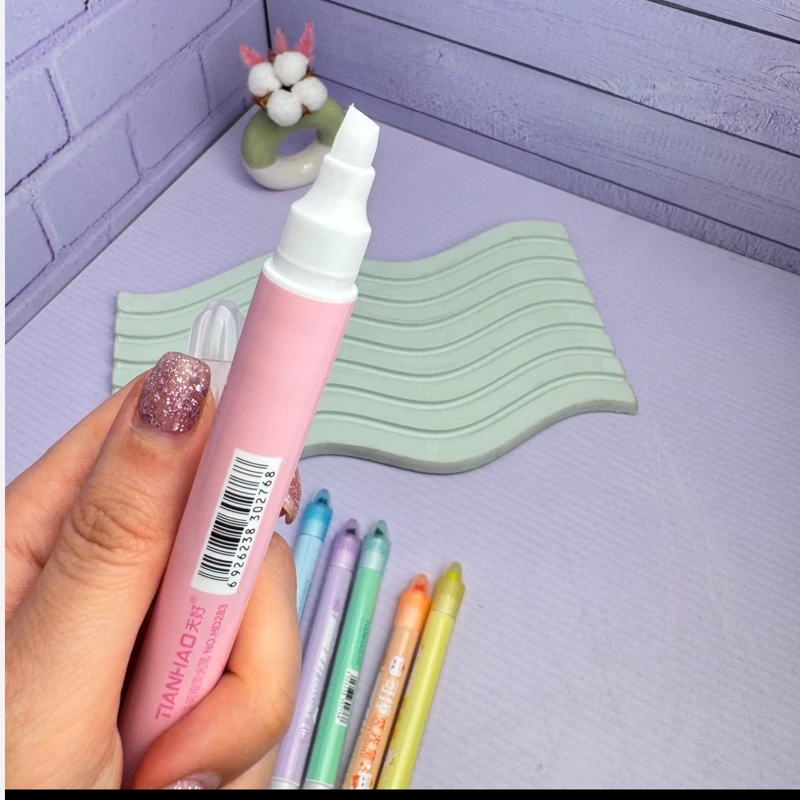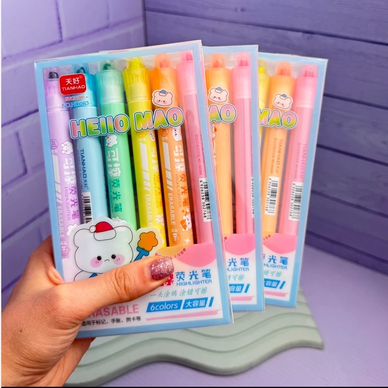 هایلایتر پاکن دار دوسر فانتزی 6 رنگ یه سر رنگی و سر دیگه سفید هست که پاک میکنه سایز بزرگ تقریبا دوبرابر هایلایتر های دیگه ست دیگه هرجا رواشتباه هایلایت کردید اصلا نگران نباشیدچون با سر دیگه ش خیلی راحت مثل اولش پاکمیشه بسیارباکیفیت وارداتی